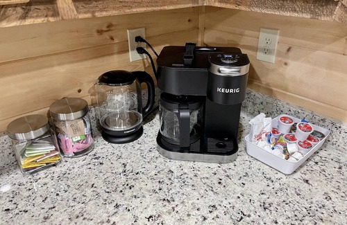 The main level features a gourmet kitchen with waffle bar, dining room, family room, and 2 bedroom suites with bathrooms. When you wake up, the fully stocked kitchen is ready for you to prepare all your favorite meals. This newly built cabin features a brand new stainless steel oven, gas stove, microwave, and refrigerator with an ice maker. Other appliances include a Crockpot, waffle maker, toaster, blender, keurig & drip coffee maker, Moka pot espresso maker, and all the cookware necessary to make a gourmet meal. A washer and dryer are located on the first level and a gas grill is also available. The main level also features a covered deck, highlighted by a wood-burning outdoor fireplace and sitting area.