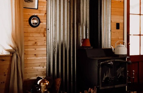 Thompson's Hut is a cozy cabin with original and updated features warmed by a wood fire and electric heater. Two vintage chairs encircle the fireplace for great story telling.