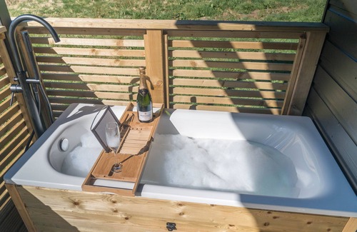 Cabin, with deck and outside bath in woodlands | Cabin in Balfron Station, United Kingdom