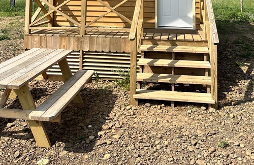 This cozy one room cabin is full of rustic charm and has a Twin XL/Full XL bunk bed and a full size futon sleep so it can sleep 5 guests, table w/ 4 chairs, microwave, coffee pot, mini fridge, shower/toilet/sink, Mini split A/C & Heat, Electric space heater, and tankless water heater for endless hot showers! Each cabin has a picnic table and fire ring with cooking grate outside. These are camping cabins so you'll need to bring your own towels, linens, and cooking supplies just as if you were tent camping. Toilet paper and coffee filters are provided. Ice and firewood are for sale onsite.
