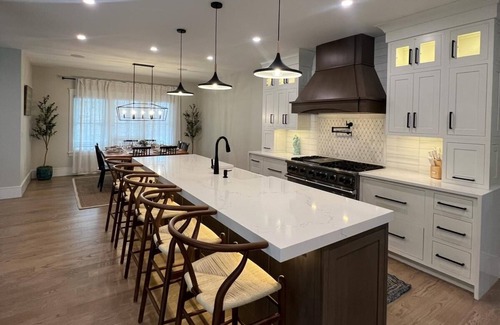 New house with 5,800 sq/ft ,for 13 guest ,1st Floor Primary bedroom with soaking bathtub , open kitchen with living room and dinner room , Laundry room ,full bathroom with sauna , a office and 2 car garage