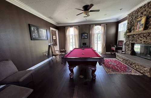 Opal Oaks is a fully privately-gated estate that sits on 5 beautiful acres in prestigious south Lakeland next to other beautiful luxury homes. Once home to a local family, it has now been renovated into a rare VRBO experience, more like an unstaffed boutique hotel. Some of the themed bedrooms will have their own private bathroom & others will have a shared bath/shower (read each listing). However, there are 2 common area bathrooms on the first floor that all guests may have access to. One is between the Lounge & the Kitchen. The other is at the Pool.