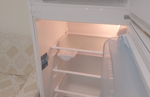 The kitchen has a fridge, a hob, an oven, a kettle, a freezer and a microwave.