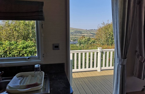 Our top spec caravan is situated on a hillside with open views of the sea over the bay of Swanage and across to the hills towards Old Harry's Rock. The views from sofas and decking are breathtaking. A 15 minute walk to the town and sea front of Swanage and a 15 minute drive to the stunning Studland beach and ferry across to Sandbanks. There are multiple cliff top walks to Lighthouse and Durlston Castle and country park from caravan. Large Pool can be used on next holiday park with a fee.