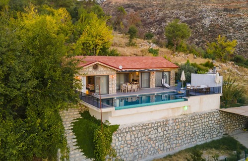 Antalya'nın Kaş ilçesine bağlı Kalkan Üzümlü mevkiinde konumlanan kiralık Villa Carina, kendine ait havuzu, bahçesi ve 2 yatak odası ile 4 kişi konaklama kapasitesine sahiptir. Yapımı 2021 yılında tamamlanan taş mimariye sahip villamızın havuz ve bahçe terası dışarıdan görünmeyecek şekilde korunaklı olarak dizayn edilmiştir. Yemyeşil doğa içerisindeki konumu ile benzersiz bir tatil deneyimi sunmaktadır. Villamız muhafazakar tatil tercih eden aileler, arkadaş grupları ve balayı çiftleri için idealdir. Ayrıca portatif açılabilen 1 adet ek yatak imkanı ile talep edilirse 5 kişiye kadar konaklama imkanı sunmaktadır