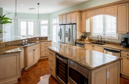· A spacious kitchen with large center island for food preparation features gas Wolf range, 2 refrigerators, 2 ovens, 2 dishwashers, wine fridge and microwave