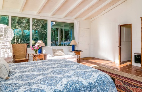 Outside, a large pool is surrounded by Adirondack chairs, and a pathway leads to the vegetable gardens. Set on 18 acres of avocado trees, there's no shortage of space!