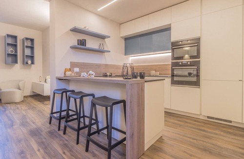 The spacious living area, with its sofa bed and TV, invites relaxation, while the fully equipped kitchen – complete with refrigerator, induction cooktop, oven, and coffee machine – allows you to prepare delicious meals, just like at home. The two double bedrooms offer a cozy and peaceful retreat, perfect for a restful sleep. The modern, functional bathroom is equipped with a spacious shower, sink, bidet, and WC.