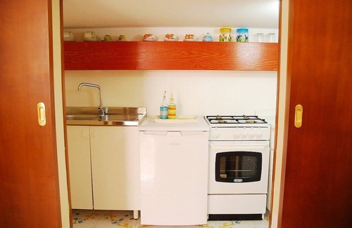 You will be able to enter the kitchen from the living room. It is equipped with a four-burner gas cooker, an electric oven, a refrigerator with freezer, a microwave oven, an Italian-style coffee-maker and a kettle. From the kitchen a French door will take you to the second terrace.