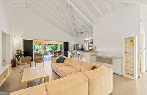 Inside Casa Rubio is a spacious living room with high ceiling, and again a TV, and a spacious sofa, and a kitchen.The kitchen is equipped with everything you need to prepare a meal. A large American fridge/freezer is of course essential in a tropical villa. The villa has 4 bedrooms and also 4 bathrooms. All bedrooms have air conditioning. There is also a washing machine.