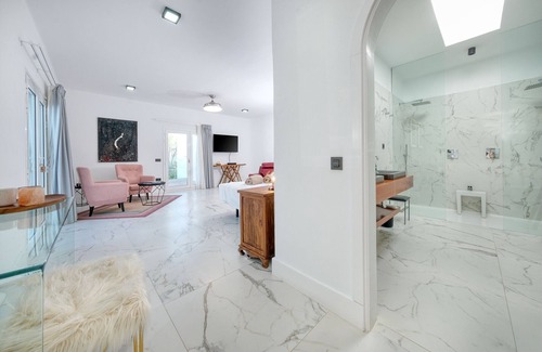 Located in the charming village of Macher, this exclusive suite is ideal for those seeking an elegant and tranquil atmosphere. At Casa Serena, our cosy guest house, you will discover the perfect place to disconnect and rest in a refined and serene environment.Suite number 5 is one of our most spacious, with two direct accesses to the pool, where you can enjoy unforgettable sunrises under the sky of Lanzarote. This spacious suite offers a tranquil living area with two comfortable armchairs, perfect for relaxing while watching the sunset. Natural light floods the spacious bathroom through the large skylight, illuminating the space. The bathroom features a double rain effect shower and gleaming white marble walls.With a generous area of 36 m² and a bathroom of 12 m², the suite is equipped with sophisticated furniture. It includes a king-size bed, a living area, a 55-inch smart TV, a safe, and an exclusive Armani-designed bathroom, with double washbasin and double shower.Moreover, the suite is equipped with all modern amenities, such as air conditioning, hairdryer, high-quality toiletries, and WiFi connection. It also features a minibar to refresh your favourite drinks.Casa Serena, located in a rural setting, offers incomparable tranquillity, without compromising easy access to the island's main attractions. Guests can enjoy the sun in the solarium, which features a heated swimming pool during the winter months, perfect for year-round use.Start the day in our cosy breakfast room on the ground floor, where you can enjoy inspiring sea views. Between 8:00 and 10:00, we offer a breakfast prepared with fresh and local ingredients, which capture the authentic essence of the Canary Islands flavours: cheeses from Lanzarote, seasonal fruits, salmon from Uga, artisan bread, ham, yoghurt, pastries, cereals and eggs cooked to your liking.Casa Serena is not just a place to stay; it is a luxury refuge that invites you to disconnect and immerse yourself in the natural beauty of its surroundings, while enjoying all the modern comforts you deserve.