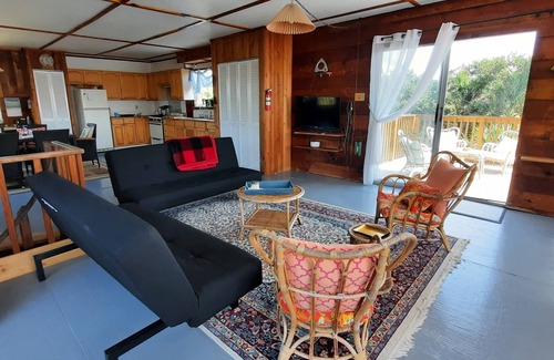 The island retreat home is a spacious two bedrooms, one bath, an open kitchen, dining and living area with a wrap around deck. Access to the roof top provides amazing views of sunrise on the bay and sunsets on the ocean side of the island.
