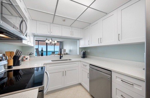 Step into a stylish open-concept living/dining space with incredible Gulf views that make every moment feel like a vacation. The modern, fully stocked kitchen features quartz countertops and stainless steel appliances, perfect for preparing everything from casual snacks to gourmet meals. Imagine sipping coffee with the sunrise and watching the waves from your private waterfront balcony—this is what vacation was made for.