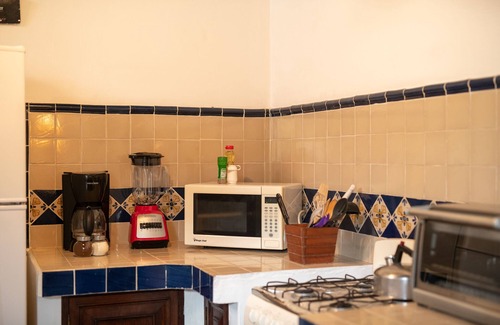 Casita del Escritor's bedroom features a queen bed and work space as well as a TV with cable and strong wifi. A twin bed can be added for a third guest. With a fireplace, the apartment’s living room offers the perfect place to spend your evenings. The apartment has a fully equipped kitchen where you can prepare any meal and enjoy in the dining room. The apartment’s full bathroom has hot water and a stand-in shower. The apartment is decorated in colonial style and windows fill the space with natural light. As this property is street-facing, there is the potential for noise from the surrounding areas.