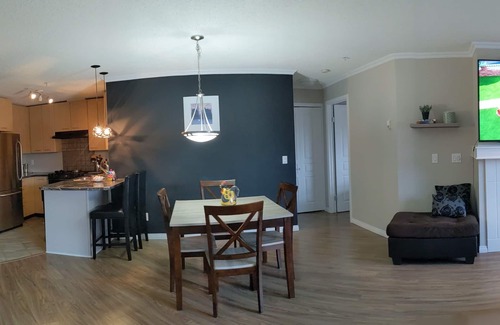 We invite you to stay in our beautiful spacious condo. Open concept with no carpets. Fireplace, breakfast bar, dining area, living room, and a beautiful patio with mature trees right outside. Gym inside the building. You will love the convenience of having a small strip mall next to the building with restaurants and a small pharmacy.