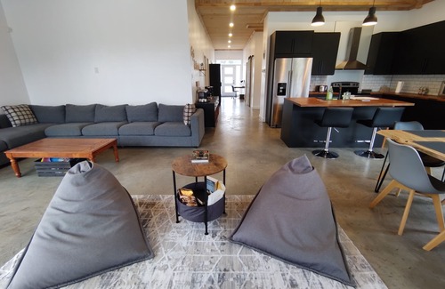 A relaxation area with beanbags faces the fireplace and a sofa that can accommodate up to 8 people envelops the room. To make your stay as pleasant as possible, a large modern spa surrounded by privacy panels is available.