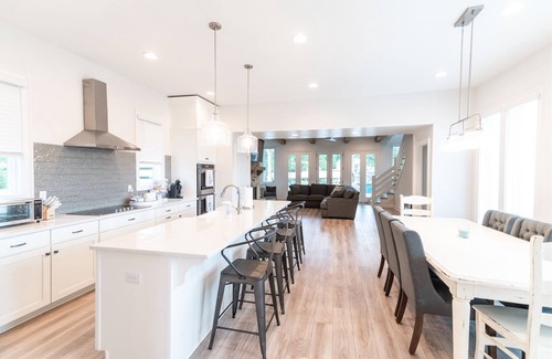 Discover the beauty of Lake Martin's serene lake lifestyle at The Point in Holiday Shores. No detail has been overlooked to make your stay memorable! This cottage-style home boasts plush accommodations, beautiful furnishings and is well suited for groups of all sizes.Entertaining is a breeze with its fully equipped kitchen which is both functional and beautiful. There is plenty of room for gathering at the giant island while meals are prepared as the open floor plan allows for easy sight into the living area and lake views. The primary bedroom suite with king size bed and walk-in shower is located on the first floor along with a half bath and the laundry room. Upstairs are 3 additional bedrooms all with queen size beds - one room with its own bathroom. A loft space with built-in bunk beds offers 4 more twin size beds. A hall bath completes the upstairs! Outside a covered porch with bed swing, fireplace and Traeger grill with pellets makes for the perfect place to watch the sunrise or sunset. Enjoy direct waterfront and pull your boat up to the large dock with stairs for swimming! Centrally located near all Lake Martin's hot spots! The owner has made it extra child friendly with all the things needed to travel with kids of all ages - children’s toys, lake toys, pack n’ play & changing pad, innertube, fishing poles, gymnastic tumbling mat and more! And for the bigger kids: poker table for 10, inflatable movie screen & projector, popcorn maker, paddleboard, floating island, and more! While we don’t recommend it - if you must work while you are at the lake, there is a desk equipped with 2 computer screens, ready to for your laptop to connect! No pets allowed. No smoking allowed. 2 car driveway limit. No street parking - overflow lot only.