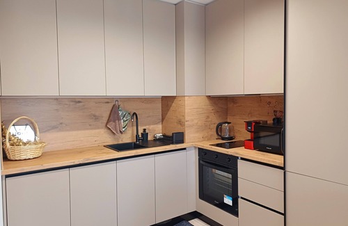 The open aria kitchen is equipped with a fridge and freezer, an oven, induction stoves, dishwasher, coffee machine, microwave, bread toaster, teapot, hot water kettle, plates, cutlery and glasses, pots and pans, etc. Therefore, you are more than welcome to cook yourselves a nice breakfast and enjoy it inside at our cozy kitchen area. Included are coffee pods, tea bags, bottles of mineral water, sugar and sweeteners, spices, as well as various breakfast products.
