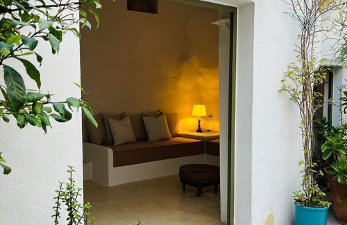 Off one side of the private courtyard stands the living room, a bedroom and bathroom. On the the other side, you’ll find the second bedroom and bathroom as well as the kitchen. Head upstairs to the rooftop for the summer kitchen and covered dining area, great for enjoying the view and sunset after a day at the beach!