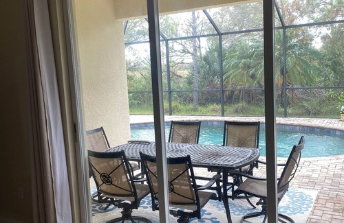 Beautifull 4bed/3bath home with private pool in the amazing community of Stoneybrook- Venice FL. First time on the vacation rental market, no reviews yet. The bedrooms furnitures are currently being updated. HOA approval. Open floor plan, master ensuite features a shower, soaking tub and double sinks. Guest room has a full bathroom. Large kitchen with island, granite countertops. Step out onto the lanai/ pool area and enjoy the beauty that nature provides with the pond, conservation area and sunset view. Enjoy the clubhouse, gym, heated resort style pool and spa, tennis courts, pickleball, basketball, volleyball, horseshoes, baseball field, soccer field, hockey ring, playground all in a gated community. Close to downtown Venice, Wellen Park, Braves baseball field, shopping, many beautiful beaches on Gulf of Mexico, I-75. Book now and enjoy everything this brilliant property has to offer.