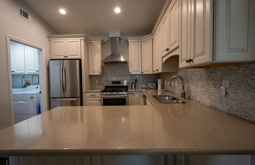 The kitchen is fully equipped with a stainless-steel range, vent hood and quartz countertop for easy cleanup after cooking. In the back you will find a paver patio with ample seating and charcoal grill. A perfect place to have a drink while grilling.