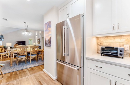 This vacation rental property is great for those who have trouble with steps as there are only a few leading up to the front door. It has a spacious living room, a fully equipped kitchen, a washer and dryer, linens and bath towels, a departure housekeeping service and a starter supply of paper products and detergents.