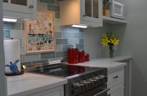 *Brand new kitchen: cabinets, countertop, appliances, floor, ceiling and best of all, more ocean-themed mosaics!