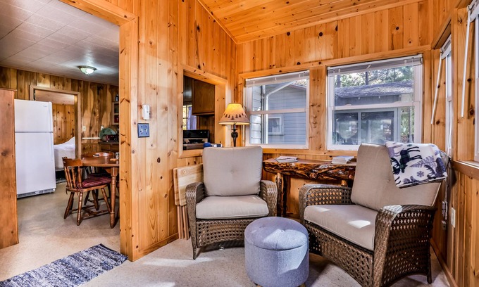 At the cottage, you’ll find a cozy, rustic living area finished with knotty pine walls. Whip up a snack in the full, eat-in kitchen, then grab a bite at the table for four. There's no internet - and spotty cell service - but if you must stay connected, a hot spot will sometimes work on your phone to stream on the bedroom TV. But evenings are best spent outside, gathered around the firepit, admiring the stars, and telling tales of the one that got away.