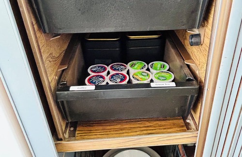 :: Kitchenette w/ electric cooktop, sink, frig, coffee/tea station
