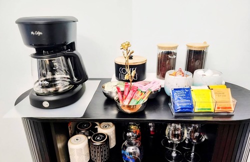 Inside, the cozy living space invites you to unwind with soft lighting, plush seating, and thoughtful touches throughout. The fully stocked kitchen includes all the basics—cooking oil, spices, pots, pans, and more—so you can prepare meals with ease. Enjoy coffee, tea, or hot chocolate at your convenience from our complimentary coffee bar.