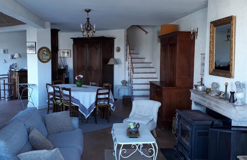 A large reception room (60m2) with a view of the castle and the port entrance. A forest to cool in the summer and make cabins a real playground for children. a real family home where you will feel at home. Wifi available.