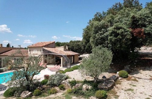 This charming villa with heated swimming pool near Eygalières has an unfenced plot of 4000 m2 and enjoys a magnificent view of the surrounding olive groves.