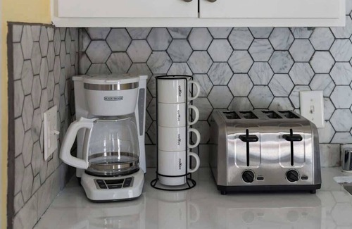 Kitchen: Full-sized stainless-steel fridge, gas stove, dishwasher, microwave, large apron sink, drip coffee maker, toaster, and grill press. Fully stocked with utensils, cookware, bakeware, and dinnerware.