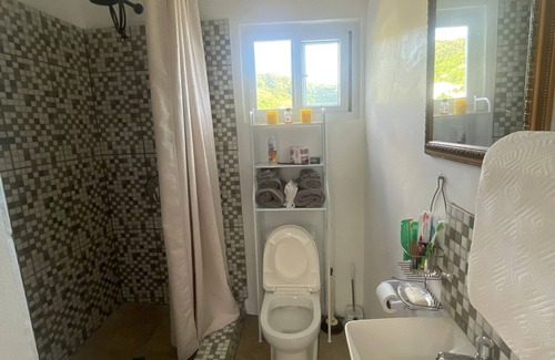 Has two separate bedrooms, kitchen, bathroom and utilities, an open living, dining area on a large patio, with great views overlooking the Caribbean sea and lush green mountains. Very tranquil and airy.