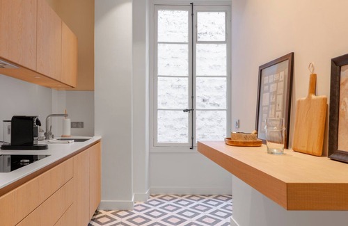 This elegantly renovated Parisian apartment exudes charm with its sleek wooden cabinetry and modern kitchen appliances. The spacious bathroom indulges with a large bathtub and a refreshing walk-in shower.