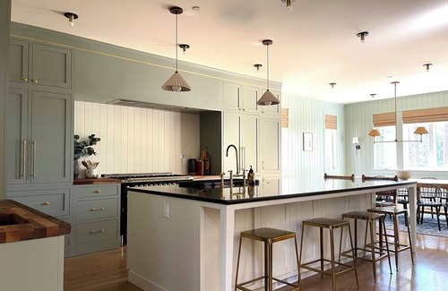 The fully stocked custom kitchen is ready to provide you everything you will need for fantastic family dinners, holidays, or feeding a large groups. Boasting floor to ceiling cabinetry, fully integrated appliances, soapstone counters, three dishwashers, 2 ovens, + an oversized island prep area with seating for 8. The dining table is just steps away and it seats 10 to 12 comfortably.