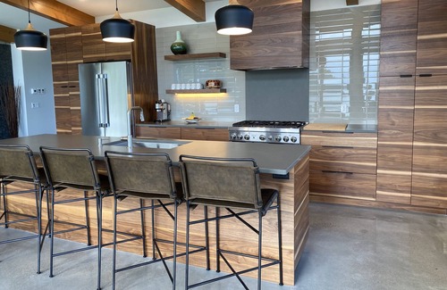 Our home is clean modern living at its best with a cozy vibe and includes beautiful new gourmet kitchen of walnut cabinets, 10 foot island, coffee station, high end appliances including a beautiful Thermador gas range and all the tools needed to prepare a gourmet meal. A large 6 person dining table for your family to enjoy many meals around, or eat outside on the expansive deck and take in all the harbor has to offer. Or if you choose you can soak up the sun and the salt air in the loungers on the deck.