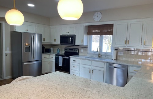 Perfect home for a weekend getaway or long-term stay. Clean and cozy 3-bedroom (1 queen, 1 full, 1 twin) sleeps up to 5 with lots of space to unwind. Featuring an in-ground pool and park-like lot, the charming cottage-style home is nestled in a quiet neighborhood just a block from beautiful Belleville Lake and an easy walk or bike ride downtown. Home features two full and one half-bath, and recently remodeled kitchen is well appointed with everything you need to feel right at home. Three Smart TVs, WiFi, whole-house generator (for unexpected Michigan weather) and ample street parking make it a safe and comfortable place to relax and enjoy everything Belleville has to offer.