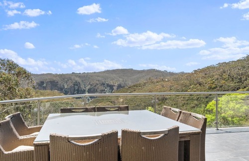 Cliffnest is a six -bedroom property located on one of the best streets in Katoomba with 180-degree views of the escarpment in a serene bush setting. This 6 bedroom, 7 bathroom, pet-friendly house is located 4 minutes from Katoomba Mall and is a wonderful base from which to explore the spectacular national parks, bush walking trails and quaint townships of the Blue Mountains. There is ample living space, is centrally heated and has a double-sided gas fireplace.