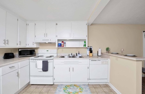 Continuing down the hallway from the kitchen, you'll discover the inviting master bedroom with a comfortable queen bed, as well as the third bedroom featuring a charming twin bunk bed. The two full bathrooms, conveniently located along this hallway, also house the washer and dryer for added convenience. Each bedroom provides ample closet space, allowing you to keep your belongings organized during your stay.