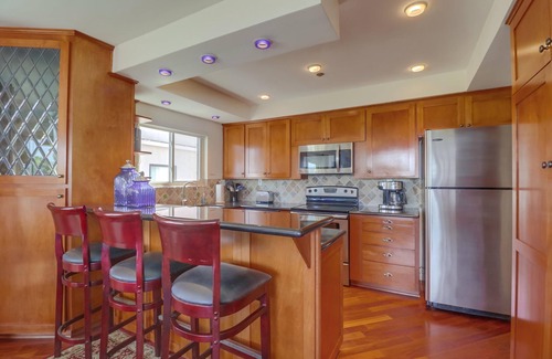 A beautiful, newly remodeled condo overlooking San Juan Cove, will be the perfect location for your San Diego holiday. Situated on the third floor, you will enjoy spectacular views of sunrises in the morning and seasonal fireworks in the evening from your private balcony. This spacious two bedroom, two bath retreat is nestled against the bay and just steps from the ocean. It comfortably sleeps up to seven people. There is a king-sized bed and a Click Clack sofa in the master bedroom, two full-sized beds in the second bedroom. We have a 50-inch HD flat screen in the living room with a DVD player that is Blu-ray with built-in wireless, so those with a Netflix or Pandora account can now stream your favorite movies. There is also a new sectional couch in the living room. There is also 32-inch HD flat screen in the master bedroom. Includes Wireless high speed internet enabling you to stay connected to the outside world and the local happenings. The building has an elevator and one outside parking space for your use. NO PETS ALLOWED.