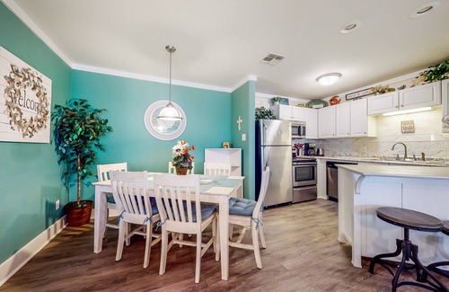 Featuring bright, coastal tones and décor, the interior offers an open layout for gathering with friends and family. The living area offers sofa seating, a cozy electric fireplace, and cable TV. A partially separated seating area comes equipped with a dedicated desk, perfect for remote work needs. The full kitchen comes updated with a gorgeous backsplash, counters and stainless steel appliances so you can plan at-home meals for your stay. There's breakfast bar seating for two and an indoor dining table set for six. You can also enjoy meals al fresco, at the four-seater dining table on the balcony.