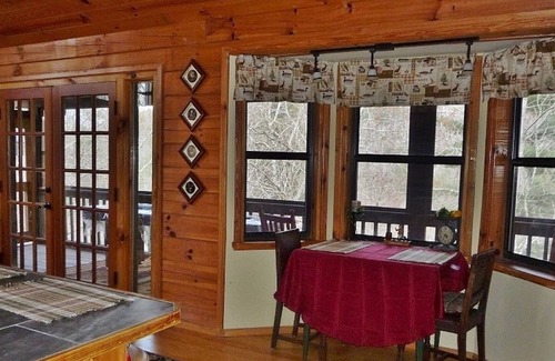 Unfortunately, we will be closing our little slice of mountain heaven as of 1 August due to the owner needs to sell it. Our wheelchair ramp begins on the driveway with a level concrete pad. The ramp accesses a large, sunny deck on the front of the house. The entrance and main floor doors are 36 inch wide, except for the 1/2 bath, which is barely big enough for a person, let alone a wheelchair. Home is a beautifully decorated log cabin with a strong country theme, to include a fireplace with firewood provided. The main floor primary bedroom has a comfy king-size memory foam mattress and a wall mounted TV. We have included two office mats (underneath the bed) for those bringing Hoyer lifts. A barn door in the bedroom accesses an in-suit bath with a barrier free shower, grab bars, and a wall-mounted shower seat. It has ample room around the toilet with a grab bar as well as two ADA sinks. There is ample turn-around room in the bathroom for a wheelchair. Accessibility was not an afterthought, but the result of planning to developing a friendly environment. Open main floor has ample, fully equipped kitchen with stove, microwave, refrigerator, dish washer, garbage disposal, farmhouse sink and dish washing soap and dish washer soap provided. The comfy living area has a wall-mounted TV with DVD/Blue Ray player, numerous DVD movies, Dish Network, and a super NES Classic with over 200 games loaded on it. Our fireplace is well stocked with firewood provided as well as fire starters. There is also a ramp from the living room to the shaded, fully screened upper back porch which extends the entire back of the house. It is equipped with ceiling fans and rocking chairs to relax on. There is also access to the same porch from the primary bedroom at the opposite end. A wheelchair can access the larger lower back deck by way of the front ramp then on down the driveway, where there are two nicely decorated bedrooms (each with queen size memory foam mattress), a full bath with shower (no tub), and a laundry room with complimentary washer/dryer and clothes washing detergent and dryer sheets. Wheelchairs can get in and out of the bedrooms via the outside sliding doors, but the hallway and bathroom downstairs are restrictive for wheelchair access. The downstairs game room is wheelchair accessible from the outside sliding doors, which has a regulation sized pool table, our 9' shuffleboard table (with bowling accessories too), a card table, kids chalkboard easel and a 9' Speedball table, along with numerous board games, and puzzles. We now have a 5-person spa/hot tub that is available year-round! No need to bring towels as we have lots of beach towel for you to use. We have 3 bedrooms, 2 1/2 baths - easy sleeping room for 6, and we can accommodate a few more if necessary, so let us know and we will advise you on the extra sleeping space. Both full bathrooms have small sundries in place (mini bath wash, toothpaste, toothbrush, mouthwash, razor just to name a few). Living room beanbag unzips into a kid-friendly full mattress, along with a full mattress on the sofa sleeper. Upon request we can also provide a comfortable queen air mattresses (on legs) that can be setup in the game room. The internet is available but is about like playing chess with a tree-stump, that means that it's very slow. We have a small collection of books as well as over 100 movie DVDs to choose from. There is a nice new brick barbecue area with charcoal provided and BBQ tools to use located next to the game room entrance. There is a flood light for this area and the light switch for it is located in the game room. The air is clean and clear, and no other sound intrudes into the area except for the sounds of the Hiawassee River which speeds by at the bottom of the property. We have 3 acres of woods and hills around the cabin and rolling hills around you. It is very peaceful and secluded with few neighbors, making it a wonderful place to center yourself and refocus on the important things around you. WIFI and internet are present and terrible (sorry, it is the terrain, not the equipment) so put your devices away and actually get to know each other again as this is a wonderful place for that. We have a phone connected for use if you can't get a signal on your cell phone while here (Verizon seems to be the only one that provides decent service in the cabins area). There is a fire pit that we have just a few steps down the hill from the bottom deck of the cabin. Late night Smore's and roasted marshmallows are always a hit. We have various locations on the property that you can walk to and hang our hammocks in, relax on a bench or some of the outdoor furniture and immerse yourself in nature. We have made every effort to create a special, healing environment for you and your family and friends. If you are looking for other adventures, many are available in the area. We are just a few miles from the John C Campbell Folk School if you want to take a class in just about any hobby that you can do by hand. There are lots of antique shopping opportunities, waterfalls to visit, fishing to do as well as whitewater rapids, hiking trails, and even the casino in Murphy. Brochures are readily available in the cabin for your use. We're sure you'll be glad you were able to spend time in our neck of the woods! We are on a well and do apologize if it occasionally has an odor when using the water, but it does not stay on your skin after washing.