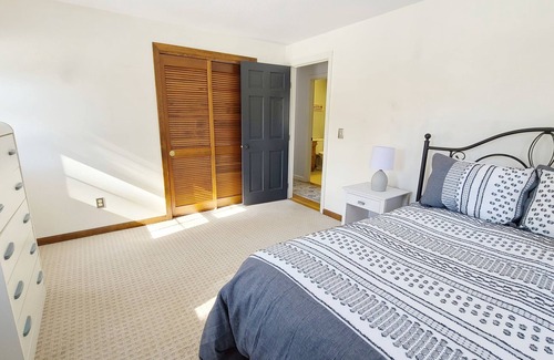 Down the hall from the main living area is a bathroom with tub/shower and two bedrooms--each with a queen bed. Stairs from the living room lead to the primary bedroom on the second floor with queen bed and ensuite bathroom with tub/shower. Hardwood floors in the main living area and carpet in the bedrooms.