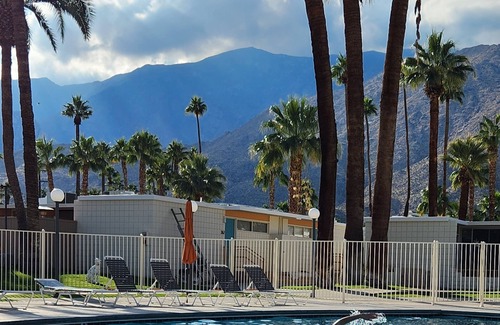 This one-bedroom ground floor apartment is in the Ocotillo Lodge, the famous Mid Century Modern Palm Springs landmark known for its fabulous huge champagne cork shaped pool. The bedroom has a California king-size bed, and the living room has a leather couch , and a comfortable powered leather recliner.