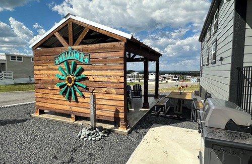 223”. A covered Pavilion steps off the front porch with seating, TV, and Propane Firepit