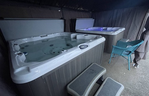 The new courtyard has two hot tubs, a conversation area with a propane fire, a 36" propane grill, all covered by gazebos (also screened and solid curtains) for use 365 days a year! There are also 2 charcoal BBQs and 1 charcoal smoker. Please bring your own charcoal.
