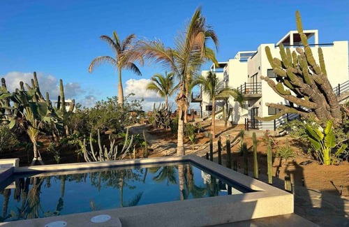 Welcome to Villas del Scarlet Cardones! Retreat to our peaceful upstairs condo in the heart of Cerritos. This is the only swim-able beach north of Cabo on the Pacific! Take in the ocean views and amazing Sierra de la Laguna mountain range from the property on your very own rooftop balcony. The condo is a 2 minute walk from the beach, restaurants and bars. We're located around 1 hr from Cabo and only 7 kilometers (10-15 minute drive) from Todos Santos. A/C, Pool, Hot Tub, Outdoor Grill, and WIFI access!