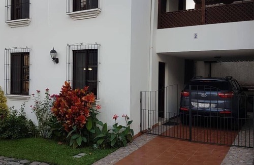 The condo is 2 stories and is newly renovated. It has 2 bedrooms and sofa bed downstairs. It has its own garage and the kitchen is fully equipped. It is in a gated community with a communal pool. It has 1.5 bathrooms. It is in a hidden gated condo complex which is 5 blocks from the center of Antigua. It is also a few blocks from most of the best restaurants and bars in Antigua. The pool has a charcoal grill and a large seating area with tables so you can enjoy grilling and meals by the pool. You can see the views of the volcanos from the condo and beautiful sunsets. The condo comes fully equipped for short or long stays. There is 24/7 security with a camera system and a guard making rounds for your enhanced safety. Cleaning is also available for lengthy stays on a regular basis.