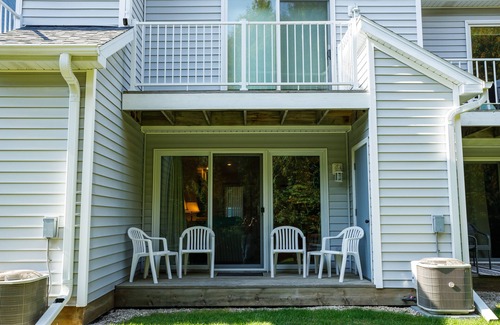 This two-story condo with a private entrance comfortably sleeps six with two upstairs bedrooms and a living room sleeper sofa. The first floor features a half bath, and the full upstairs bath boasts a spacious jetted tub. Want to eat in? Enjoy the fully-equipped kitchen. Catch up at the dining room table or relax in front of the large fieldstone gas fireplace while enjoying your favorite shows on the 52-inch smart TV. Step out onto the private 2nd-floor balcony or 1st-floor deck to enjoy a quiet morning cup of coffee. Take advantage of the heated pool and hot tub on the property, which is open Memorial Day to Labor Day.
